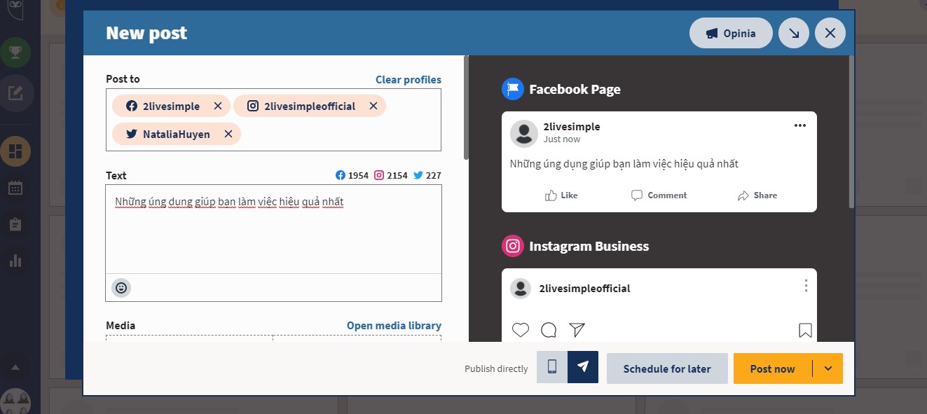 Bạn đang sở hữu trang web cá nhân và muốn lên kế hoạch đăng tải bài viết cùng một lúc trên tất cả các nền tảng mạng xã hội như Facebook, Instagram, Twitter…Qua Hootsuite ( hoặc Buffer) bạn có thể dễ dang làm điều đó. Chỉ cần tạo một bài viết hấp dẫn hay viết ra kế hoạch đăng bài trong vòng 1 tuần/ 1 tháng tùy thuộc, Hootsuite sẽ hỗ trợ bạn cách quản lý thời gian đăng tải trên mạng xã hội.