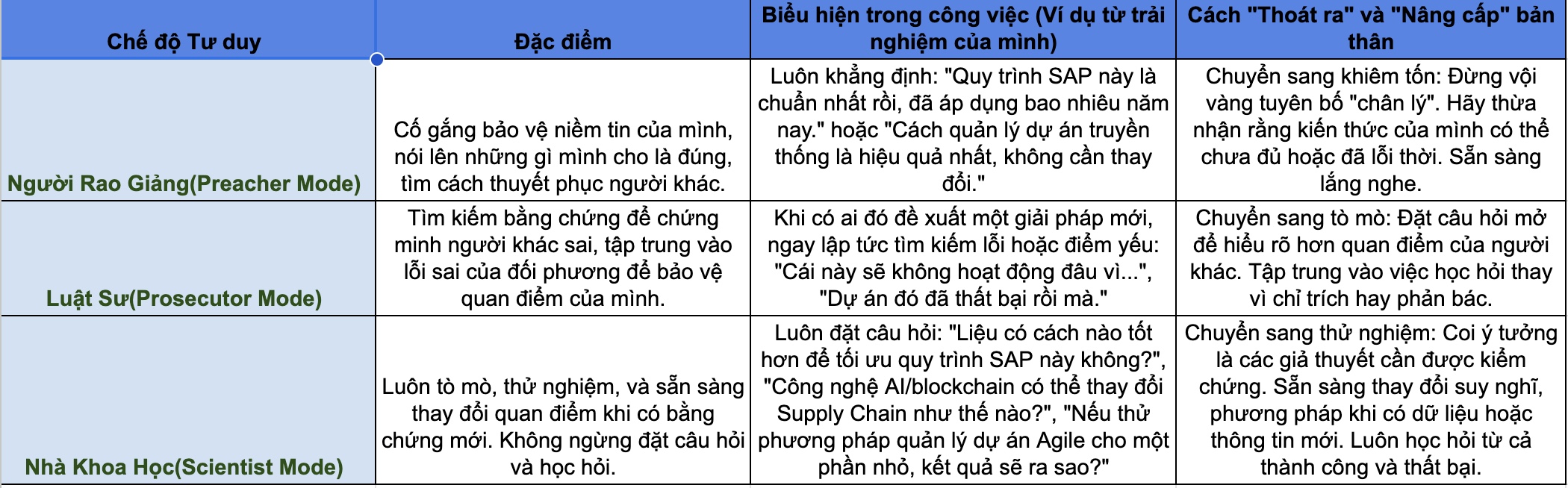 Mình từng là một chuyên gia SAP, nhưng nếu mình chỉ lặp đi lặp lại những quy trình đã học, những dự án đã làm mà không bao giờ đặt câu hỏi “Liệu có cách nào tốt hơn không? Liệu công nghệ mới có thể thay đổi điều này như thế nào?”, thì mình đã rơi vào cái bẫy của việc “sống lặp lại cái năm đầu tiên” rồi. Adam Grant chỉ ra rằng, để thực sự tiến bộ, chúng ta cần phải thoát khỏi chế độ “người rao giảng” (preacher mode) và “luật sư” (prosecutor mode) – những chế độ mà chúng ta dùng để bảo vệ quan điểm của mình – để chuyển sang chế độ “nhà khoa học” (scientist mode), luôn tò mò và sẵn sàng đặt câu hỏi.